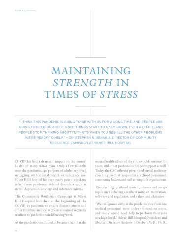 “I THINK THIS PANDEMIC IS GOING TO BE WITH US FOR A LONG TIME, AND PEOPLE ARE GOING TO NEED OUR HELP. ONCE THINGS START TO CALM DOWN, EVEN A LITTLE, AND PEOPLE STOP THINKING ABOUT IT, THAT’S WHEN YOU SEE ALL THE OTHER PROBLEMS. WE’RE READY TO HELP.” – DR. STEPHEN N. XENAKIS, DIRECTOR OF COMMUNITY RESILIENCE CAMPAIGN AT SILVER HILL HOSPITAL