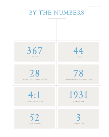 BY THE NUMBERS ANNUAL REPORT 2022 367 EMPLOYEES 44 NURSES 28 INPATIENT BEDS, LICENSED UP TO 39 78 RESIDENTIAL BEDS, LICENSED UP TO 90 4:1 PATIENT/DOCTOR RATIO 1931 FOUNDING YEAR 52 SOCIAL WORKERS 3 LEVELS OF CARE 15