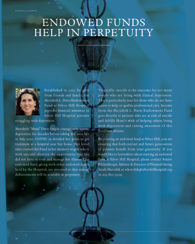 Established in 2021 by gifts from friends and family, the Meridyth L. Davis Endowment Fund at Silver Hill Hospital provides financial assistance to Silver Hill Hospital patients