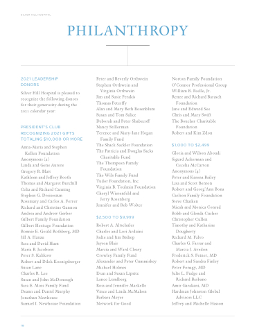 Silver Hill Hospital is pleased to recognize the following donors for their generosity during the 2021 calendar year:
