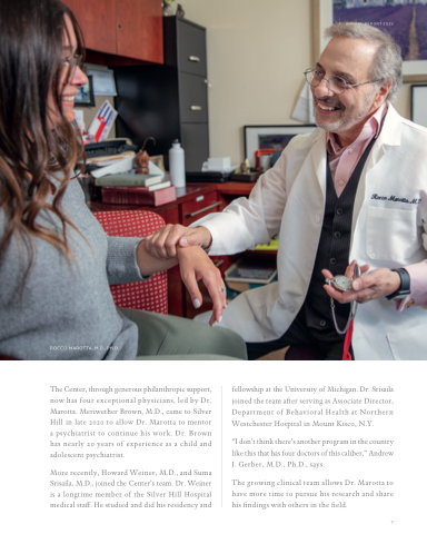 The Center, through generous philanthropic support, now has four exceptional physicians, led by Dr. Marotta. Meriwether Brown, M.D., came to Silver Hill in late 2020 to allow Dr. Marotta to mentor a psychiatrist to continue his work. Dr. Brown has nearly 20 years of experience as a child and adolescent psychiatrist.