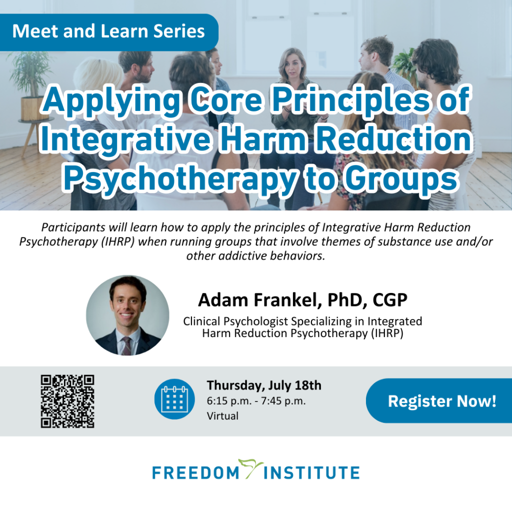 In this 90-minute workshop, join clinical psychologist, Adam Frankel, PhD, and learn how to apply principles of Integrative Harm Reduction Psychotherapy (IHRP) when running groups that involve themes of substance use and/or other addictive behaviors.
